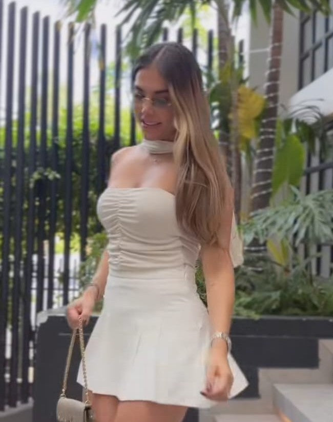 Blusa blanca de ajustar al cuello, delicada y sensual, con espalda descubierta y detalle tipo corsé en la parte trasera, perfecta para un look elegante y sofisticado.