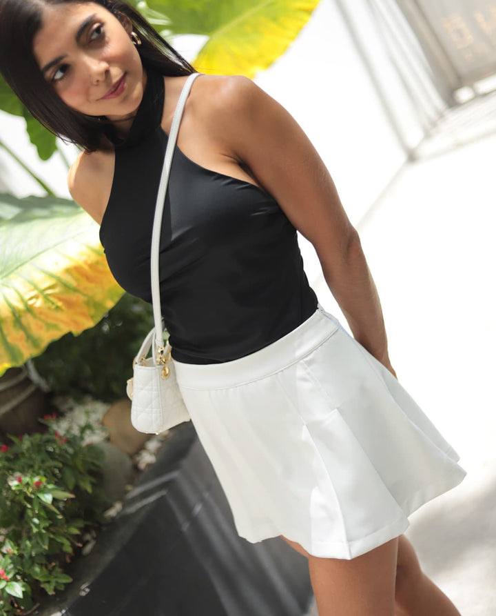 Nuestro Body al cuello y con un pequeño escote en la espalda irradia elegancia, transformándolo en la prenda básica elevada perfecta para tu armario cápsula, apto para cualquier ocasión.