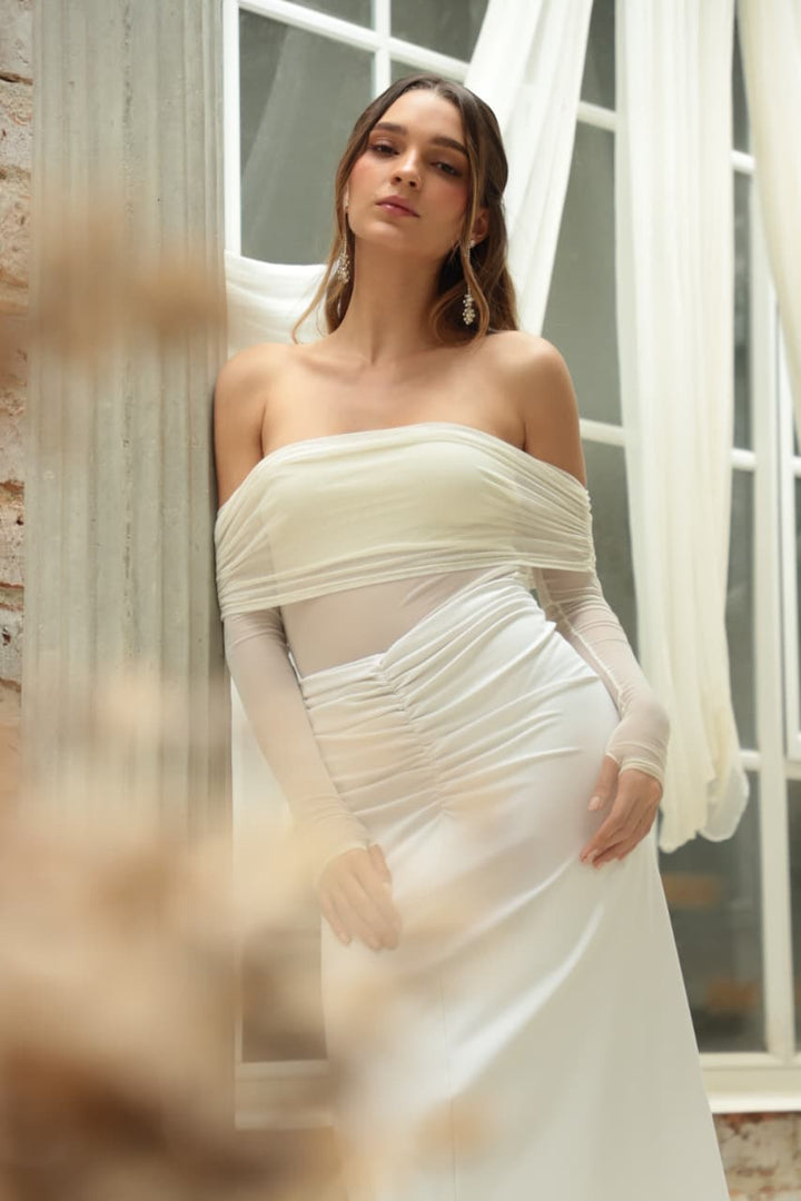 Falda larga en tejido licrado color marfil, con delicado arrunche en la parte superior que realza la silueta y aporta un toque femenino. Su textura suave y elástica garantiza comodidad y ajuste perfecto, ideal para crear looks sofisticados y versátiles.