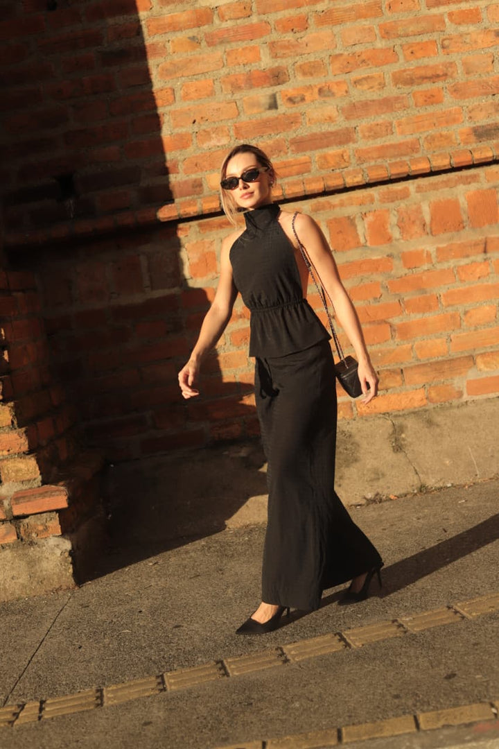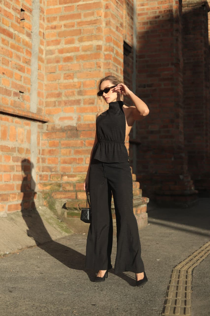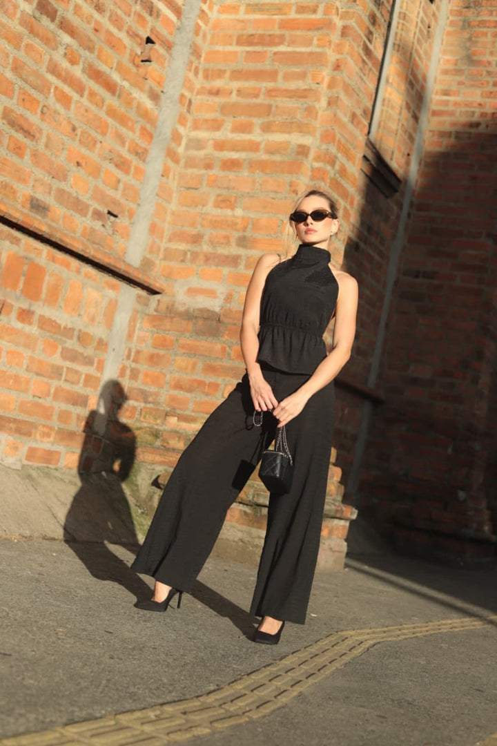 Pantalón palazzo en tejido ligero y texturizado, de caída suave y silueta amplia que aporta movimiento y elegancia. Cuenta con pretina cómoda y acabado semitransparente en las piernas para un toque moderno y sofisticado. Disponible en negro y beige.